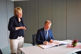Dr. Holger Spreen trägt sich in das Goldene Buch der Gemeinde Südheide ein, während Bürgermeisterin Katharina Ebeling ihm über die Schulter schaut.