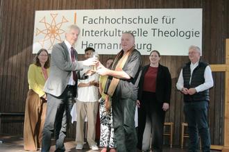 Überreichung der Kerze eines Absolventen von Rektor Prof. Dr. Andreas Kunz-Lübcke (rechts) an seinem Kollegen Prof. Dr. Jan Hermelink von der Universität Göttingen vor dem neuen Kollegium.
