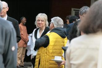Nach dem Gottesdienst, der bei herrlichem Spätsommerwetter unter den Eichen des Missionshofes stattfand, gab es ein umfangreiches Programm aus Grußworten, die wegen ihrer Länge den geplanten Ablauf des Abschlussfestes erheblichen aus dem Zeitrahmen fallen ließ. Die Moderation teilten sich Prof. Dr. Katharina Kleine Vennekate und Prof. Dr. Johannes Weth und führten durch das Programm. Die Begrüßung zum geplanten vormittäglichen Programm übernahm der Rektor Prof. Dr. Andreas Kunz-Lübcke und hob hervor, dass es keine Schuldigen für dieses Dilemma gäbe, es wäre einfach alles zu teuer geworden, was die Landeskirchen nicht mehr stemmen konnten.