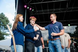 Jonathan Schulz überreicht die Gutscheinbeutel.