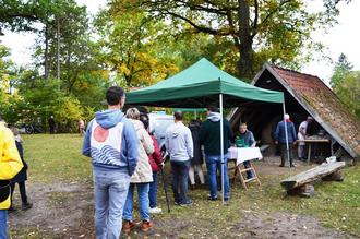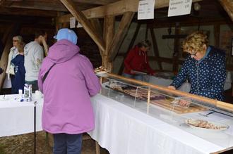 Auf dem Freigelände waren nicht so viele Tische und Bänke wie sonst platziert, aber unter dem Dach wurden sie gerne angenommen. Der leckere Butterkuchen schmeckte in dem alten Lehmbackofen gebacken natürlich noch besser und auch das herzhafte Roggen- und Zwiebelbrot, das danach in die Ofenglut kam, war schon fast verkauft, bevor es auf dem Verkaufstisch landete.