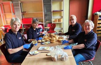 Hier sind die ehrenamtlichen Helferinnen und Helfer bei der Arbeit: es sind immer viele Brötchen und Brote zu schmieren und zu belegen, damit sich die Blutspenderinnen und Blutspender nach der Spende stärken können.