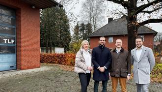 Jannis Fey und Tobias Vaasen, eingerahmt von Bürgermeisterin Katharina Ebeling und Stefan Isler, stehen vor dem alten Feuerwehrhaus, das bald Geschichte sein wird.