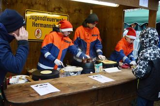 Der TuS bot wieder leckere Bratäpfel an und die Jugendfeuerwehr hatte alle Hände voll zu tun, die gewünschten Crepes zu backen. So ging es auch der Klasse 10 D der Oberschule, die heiße Waffeln anbot. Pommes und Bratwurste gehen ohnehin immer und an der Feuerschale konnte Stockbrot gebacken werden. Zusatznutzen: Feuer wärmt…