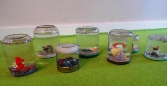 Zunächst die Figur je nach Glas mit dem Kleber in den Deckel oder auf den Boden setzen und festdrücken und befestigen. Das Glas mit destilliertem Wasser füllen, ein wenig Spülmittel ins Wasser geben. Glitter und Kunstschneeflocken dazugeben. Wer das nicht zu Hause hat oder wer den Effekt ein bisschen verstärken möchte, kann ganz normale Alufolie ganz klein schneiden und mit ins Wasser geben. Das Glas gut verschließen, Schraubdeckel mit dem Kleber gut verfestigen.