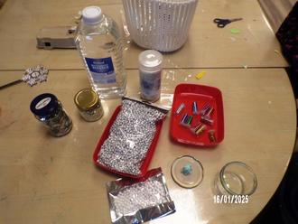 - Glitter und Kunstschneeflocken (Bastelgeschäft) oder Alufolie