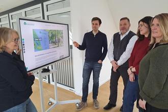 Konzeptionsgespräche auf Leitungs- und Stabsebene: v.l. Susanne von Zimmermann (Einrichtungsleitung), Yannick Tahn (Organisationsentwicklung), Peter Eberhard (Einrichtungsleitung), Maya Grass (Sozialdienst) und Nadja Fischer (stellv. Einrichtungsleitung).