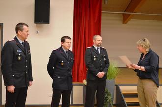 Bürgermeisterin Katharina Ebeling überreichte die Ernennungsurkunden an die neuen stellvertretenden Ortsbrandmeister von Oldendorf, Sönke Lars Rudnik (rechts), und Christian Peters von Baven (Bildmitte). Links im Bild Gemeindebrandmeister Henning Sander.