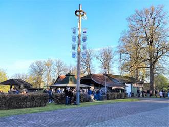 Gäste bei Bratwurst und Getränken verfolgen. Der Maibaum ziert den Dorfplatz bis in den Herbst hinein.