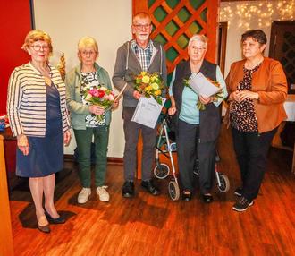 25-Jahre-Jubilare: (von links) 1. Vorsitzende Ingrid Schade - Inge Rodehorst - Heinrich Hilmer - Donata Panning - stellvertr. Vorsitzende Renate Greve. Fotograf: Wilfried Ahrens