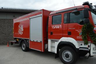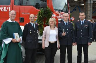 Katharina Ebeling überreichte den Fahrzeugschlüssel an Gemeindebrandmeister Henning Sander, verbunden mit dem Wunsch, das Fahrzeug möge möglichst wenig gefährliche Einsätze zu fahren haben. Und sollte es doch zu einem Einsatz kommen, so hoffe sie, dass Mannschaft und Gerät möglichst unfallfrei, erfolgreich und auf jeden Fall gesund ins Feuerwehrgerätehaus zurückkehren mögen.
