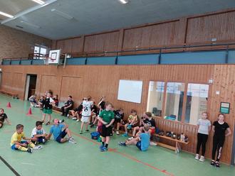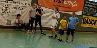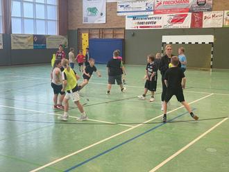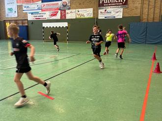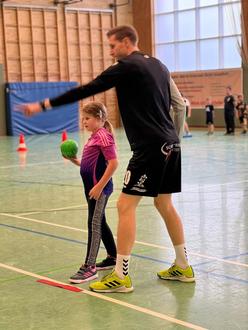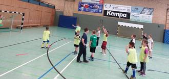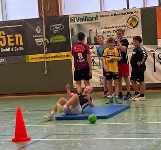 Die Gruppe bestand zur Hälfte aus Kindern, die bereits Handball spielen, während die andere Hälfte noch keine wirkliche Erfahrung mit dieser Sportart hatte. Nach einer kurzen Begrüßung und Vorstellung wurde mit „Feuer, Wasser, Sturm“ mit Ball als Aufwärmspiel begonnen. Anschließend wurde die Gruppe in zwei Teams aufgeteilt. Die erste Gruppe spielte mit Isabeau und Svenja verschiedene Fangspiele wie „Schwänzchen fangen“ und „Kettenfangen“, aber auch „10er-Ball“. Die zweite Gruppe absolvierte mit Finn und Freddy einen Team-Parcour. Dort mussten die Kinder unter anderem einen Purzelbaum machen, im Slalom um Hütchen herum prellen und abschließend auf ein Hütchen werfen, bevor sie den Ball schnell zurückbrachten, damit das nächste Kind aus dem Team starten konnte. Später wurden die Gruppen gewechselt, damit alle Kinder jede Aktivität ausgeübt haben. Danach stand auch schon das Abschlussspiel auf dem Plan: Diejenigen, die neu beim Handball waren, spielten auf dem Querfeld, nachdem ihnen zuvor die wichtigsten Regeln erklärt wurden. Hierbei sollten sie sich erst einmal ausprobieren und eigene Ideen und Lösungen finden. Auf der anderen Hallenhälfte führte Finn mit den Handballern eine Technikübung durch. Danach schauten die „Neuen“ den erfahrenen Handballern bei einem Spiel über das ganze Feld zu, um noch ein paar weitere Ideen zu sammeln und von ihnen zu lernen. Sie spielten nun erneut auf dem Querfeld und zeigten dabei vor allem ein viel besseres Zusammenspiel, sodass jeder häufig den Ball bekam. Zum Abschluss durften die erfahrenen Handballer noch einmal über das ganze Feld spielen. Insgesamt zeigten die Kinder großes Interesse und meisterten alle Aufgaben mit viel Begeisterung - alle haben es richtig gut gemacht! Jedes Kind erhielt schließlich eine HSG-Trinkflasche und Gummibärchen.