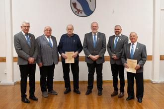 Auf dem Foto von links: 1. Vorsitzender Jürgen Holzberger, Schriftführer Werner Ettrich, Gerhard Schaper, 2.Vorsitzender Eckhard Steinmetz, kommissarischer Rechnungsführer Oliver Kliemand u. Kurt Kleindienst. Krankheitsbedingt fehlt Hartmut Schaper, dessen Ehrung zu einem späteren Zeitpunkt nachgeholt wird.