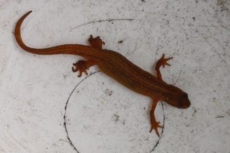 Es handelt sich sehr wahrscheinlich um einen weiblichen Teichmolch. Teichmolche sind eigentlich nachtaktiv, bei feuchter Wärme aber auch tagaktiv. Er führt ein heimliches Leben im Laub, unter und zwischen Steinen und Holz, meist in Wassernähe, z.B. Gartenteich, Tümpel o.ä. Er ernährt sich von Würmern, Schnecken und kleinen Kerbtieren.