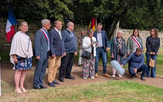 (vor dem Gedenkstein): Véronique Martin-Morvan, Denis Lefer, Hartmut Ostermann, Joachim Kuhls, Roger Leclerc (Fahnenträger), Ghislaine Brosseron, Pascal Tollemer, Colette Baczynski, Sonja Lepoittevin sowie eine Vertreterin des Assemblée national in Paris.