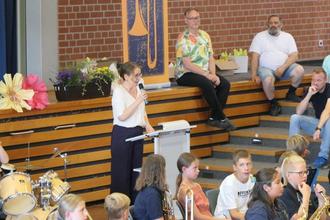 Bei extrem sommerlichen Temperaturen fand am Freitag, 15.08.2025 die Einschulung der neuen Fünftklässler*innen statt. Im mit großen Papierblüten und echten Blumen geschmückten Forum begrüßte die Schulleiterin Sandra Beckermann die aufgeregten Neulinge und ihre Eltern, erzählte, dass es in der Schule so ähnlich sei wie in der Pflanzenwelt. Auch wir Menschen seien auf Wärme, gute Pflege und die passende Umgebung angewiesen. Daher wünschte sie den Schüler*innen an der Schule die besten Voraussetzungen, um zu wachsen. Im Anschluss spielten die Bläser und präsentierten, was die Schüler*innen in nur einem Jahr gelernt hatten. Diakonin Martina Ehlers bat die Klassenlehrkräfte des neuen fünften Jahrgangs nach vorne, wo sie sich mit verbundenen Augen mit einem Seil zu einem Dreieck und Quadrat aufstellen mussten und unter Beweis zu stellen hatte, ob sie sich gut untereinander absprechen können. Nachdem den Anwesenden der Siegerbeitrag der letzten Klasse 6.3 beim Europäischen Wettbewerb gezeigt worden war, riefen die Klassenlehrkräfte die Schüler*innen ihrer Klasse auf, übergaben jedem eine Schultüte und gingen dann ins andere Gebäude, um den Klassenraum zu entdecken und einander kennenzulernen. Und dann begann für die fünf fünften Klassen die Einführungsphase, zu der neben dem Erkunden der Schule, Organisatorischem und Methodentraining auch bereits ein Jahrgangsausflug gehörte.