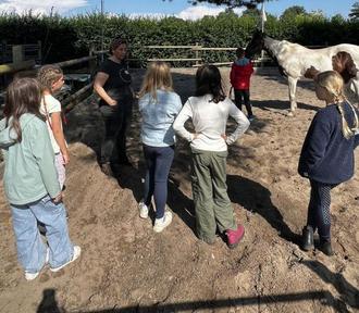 Anschließend besprachen wir gemeinsam, wie wichtig der richtige Umgang mit Pferden ist – vom Verhalten im Stall bis hin zu den Grundlagen der Pferdehaltung. Nach der kurzen Einweisung von Andy ging es in zwei Gruppen mit Mika und Pia zu den Pferden um sie gemeinsam zu putzen. Andy zeigte eindrucksvoll, wie man bei der Bodenarbeit mit Pferden kommuniziert und zusammenarbeitet.