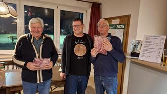Die besten Skatspieler und Knobler beim Turnier des SC Tewel mit ihren Preise(von li.): Skat-Sieger Joachim Jurgeit, Michael Tödter, Knobel-Gewinner Bernd Möhlmann.