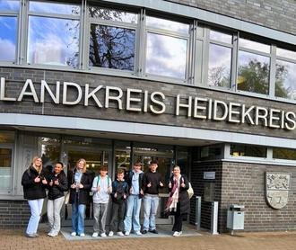 Im Anschluss wurde ein Rundgang durch das Kreisgebäude in Soltau veranstaltet. Hier konnten die Teilnehmenden verschiedene Fachgruppen kennenlernen und sich über die verschiedenen Tätigkeiten beim Landkreis Heidekreis informieren. Während der Rundgänge durch die Fachgruppen an den beiden Tagen, hatten die Schülerinnen und Schüler die Möglichkeit, selbst aktiv zu werden, indem sie Beispielaufgaben aus der Praxis erhielten und diese eigenständig lösen konnten. Zudem sammelten die Schülerinnen und Schüler viele Eindrücke aus dem Berufsalltag und spannenden Projekten durch Bilder und informative Präsentationen. Am Ende der beiden Tage erhielten die Schülerinnen und Schüler eineTeilnahmebestätigung und es wurde ein gemeinsames Abschlussfoto auf-genommen.
