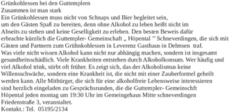 Alle Mitbürger, die sich für eine alkoholfreie Lebensweise interessieren sind herzlich eingeladen zu Gesprächsrunden, die die Guttempler-Gemeinschft Höpental jeden Montag um 19:30 Uhr im Gemeindehaus Mitte Schneverdingen, Friedenstraße 3, veranstaltet.