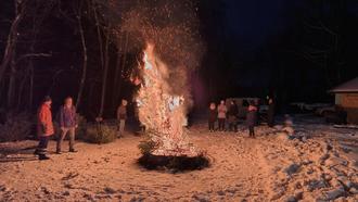 Zu dieser Veranstaltung kommt man traditionell nicht mit leeren Händen. So fanden immerhin 35 Bäume den Weg zum Feuer. Beeindruckend schnell sorgten sie für behagliche Wärme und stimmungsvolles rotes Licht.
