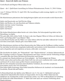 Carola Rauch und Dagmar Ohlsen laden ein zur Qunst – der 1. Quilt-Kunst-Ausstellung im Soltauer Heimatmuseum, Poststr. 11, 29614 Soltau,vom 17. Februar bis 19. April 2026. Die Ausstellung ist außer montags täglich von 14.00 bis 17.00 Uhr geöffnet.