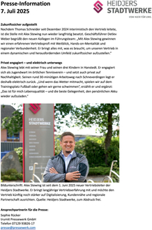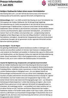Seit 1. Juni 2025 verstärkt Alex Stewing als neuer Vertriebsleiter das Führungsteam der Heidjers Stadtwerke. Der 43-Jährige bringt langjährigeVertriebserfahrung mit. Zuletzt verantwortete er den Vertrieb bei einem kommunalenEnergieversorger in Niedersachsen. Im Zentrum seiner Arbeit bei den Heidjers Stadtwerken stehen die Nähe zu den Kundinnen und Kunden, wirtschaftliches Denken und eine zukunftsorientierte, digital unterstützte Vertriebsarbeit.