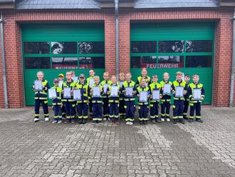 Leiferde. 20 Kinder aus fünf der sieben Kinderfeuerwehren in der Samtgemeinde Meinersen legten am Sonntag (18.09.2023) die Prüfung zum Kinderfeuerwehrabzeichen „Brandfloh“ ab. Es ist die höchste Auszeichnung, die in den Kinderfeuerwehren in Niedersachsen erlangt werden kann. Die Kreiskinderfeuerwehr hatte zusammen mit der Kinderfeuerwehr in der Samtgemeine Meinersen zur Prüfung nach Leiferde eingeladen. In Dreiergruppen durchliefen die Nachwuchsbrandschützer die verschiedenen Prüfungsstationen, die unter anderem durch Kameraden der teilnehmenden Feuerwehren besetzt wurden. So musste beispielsweise an einer Station Erste Hilfe geleistet und eine Person in die stabile Seitenlage gebracht werden. Außerdem wurde ein Notruf abgesetzt. Im Weiteren mussten verschiedene Fragen zur Allgemeinbildung und feuerwehrtechnischer Art beantwortet werden und eine großes Holzpuzzle im Team gelöst werden. Auch mussten die Kinder mit einem Feuerlöscher und einem kleinen Löschangriff Klappscheiben umspritzen. Nachdem alle Kinder durch waren, dankte Samtgemeindebrandmeister Sven J. Mayer den Kindern für ihre tollen Leistungen, alle Kinder hatten bestanden und auch den Betreuern für ihre Arbeit mit den Kindern. Kathrin Gose und Natalie Nickel stellvertretende Fachbereichsleiterinnen der Kinderfeuerwehren im Landkreis Gifhorn überreichten gemeinsam zum Abschluss allen Kindern ihre Urkunden mit den dazugehörigen Abzeichen.