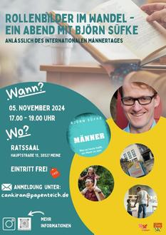 Im Oktober, der traditionell den Mädchen gewidmet ist, möchten wir diesmal eine Veranstaltung für Männer ankündigen. Anlässlich des Internationalen Männertag wird der Männerberater Björn Süfke in Meine einen Vortrag über das Thema „Männer. Was es heute heißt, ein Mann zu sein“ halten. Herzlich eingeladen sind Männer aus der Samtgemeinde Meinersen.