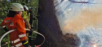 Meinersen. Der Brand einer uralten Weide beschäftigte am Nachmittag des 21. September die Einsatzkräfte der Freiwilligen Feuerwehr Meinersen. Erst durch den Einsatz von mehrere tausend Litern Wasser konnte das Feuer gelöscht werden. Gegen 16 Uhr entdeckten Kanufahrer auf der Oker die brennende Weide. Sie stand am Ufer des Flusses, rund 50 Meter südlich des Kanuanlegers am Schleusenweg. Bei den Kanufahrern handelte es sich um Feuerwehrleute aus Hannover und Peine. Sie informierten nicht nur die Rettungsleitstelle, sondern begannen mit großen Eimern erste Löschversuche. Kurz darauf wurde die Freiwillige Feuerwehr Meinersen alarmiert, die mit zwei Fahrzeugen und 15 Mitgliedern ausrückte. „Die Rauchsäule von dem brennenden Baum war bereits auf der Anfahrt zu sehen“, so Ortsbrandmeister und Einsatzleiter Kai Ludolf. Es stellte sich heraus, dass es sich um eine alte Weide handelt, die im inneren Hohl war. Dort hatten sich die Flammen ausgebreitet, durch mehrere Löcher kam es zum Kamineffekt, so dass der ausgehöhlte Baum brannte. Die Feuerwehrleute mussten sich zunächst einen Weg durch das Dickicht zu der brennenden Weide bahnen, bevor die Löscharbeiten begonnen wurden. Insgesamt dauerte es mehrere Stunden und es wurden fast 8000 Liter Wasser benötigt, welches im Pendelverkehr mit dem Tanklöschfahrzeug zur Einsatzstelle gebracht wurde, bis endlich alle Glutnester abgelöscht waren und die Feuerwehr wieder einrücken konnte.