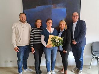 Samtgemeindebürgermeisterin Karin Single, Fachbereichsleiter Finanzen Michael Zobjack, die stellvertretende Fachbereichsleitrein Martina Genzler sowie Jan Luca Rumpf vom Personalrat gratulierten Frau Stölzel zu ihrem Jubiläum, dankten ihr herzlich für die langjährige sowie wertvolle Mit- und Zusammenarbeit.