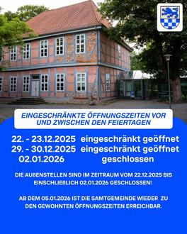 Ab dem 5. Januar 2026 ist die Samtgemeindeverwaltung wieder zu den gewohnten Öffnungszeiten erreichbar.