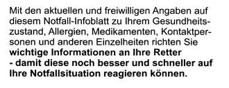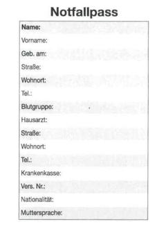 Ergänzend zur Notfalldose, ist ebenfalls in allen Apotheken der Samtgemeinde und im Rathaus Meinersen der Notfallpass kostenlos erhältlich. Dieses handliche Schriftstück passt in jedes Portemonnaie und gibt im Notfall Auskunft über die eigene Person. Neben der eigenen Identität enthält dieser Pass u. a. Informationen zu Blutgruppe, Hausarzt, Krankenkasse, Medikation, Vorerkrankungen und zu benachrichtigende Personen.