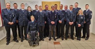 Gewählt, geehrt und befördert: Der stellvertretende Samtgemeindebrandmeister André Eckstein (rechts) und der neue Ortsbrandmeister Jan Weichsler (links) mit den verdienten Mitgliedern der Wehr.
