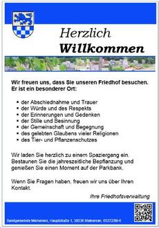 Durch einen herzlichen Empfang der Besucher sollen die Friedhöfe natürlich nicht zu rechtsfreien Räumen erklärt werden. Das korrekte Verhalten auf einem Friedhof sollte jedem Besucher bewusst sein. Und wenn doch mal ein Blick in die Friedhofsordnung notwendig sein sollte, finden sie diese im Umfeld der Kapelle. Zusätzlich ist ein Abruf über einen QR-Code auf den Willkommenstafeln, mit Weiterleitung zu der Homepage der Samtgemeinde Meinersen, möglich.