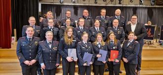 Geehrt: Der stellvertretende Bezirksjugendfeuerwehrwart Christian Arnold (links), Kreisbrandmeister Jens Dieckmann (2.v.l.) und Landrat Tobias Heilmann (rechts) mit den ausgezeichneten Mitgliedern.