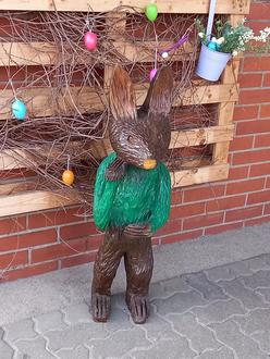 Einen einzigartigen Osterhasen, der von Reinhard Bauerfeld mit der Kettensäge gestaltet wurde. Die Kinder durften in der Werkstatt einen spannenden Blick hinter die Kulissen werfen und waren begeistert von den vielen beeindruckenden Holzfiguren.