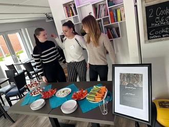 Vor der Pause – Amelie Bals, Celina Fischer und Cherisè Whersal, als Bundesfreiwilligendienstleistende und Praktikantin bereiten jede Woche eine neue leckere, gesunde, kostenfreie „Pause“ vor