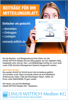 da das Mitteilungsblatt Zwischen Aller und Oker auf rein digitalem Weg hergestellt wird, können Ihre Text-und Bildbeiträge nur noch über unser CMS (Content Management System) eingereicht werden.