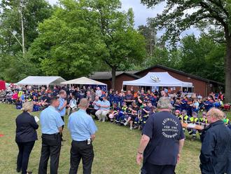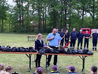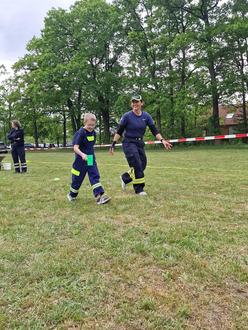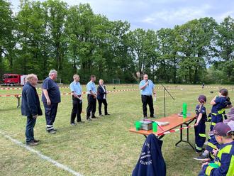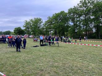 Päse. Am Samstag (04.05.2024) hatte die Jugendfeuerwehr Päse und Bauernschaft anlässlich ihres 50-jährigen Bestehens zu Spiele ohne Grenzen auf dem Sportplatz am Bürgerheim in Päse eingeladen und insgesamt 18 Gruppen der umliegenden Kinder- und Jugendfeuerwehren waren dem Aufruf gefolgt. Päses neuer Ortsbrandmeister Jan Weichsler begrüßte neben den Teilnehmern, Betreuern und Eltern sowohl Gründungsmitglieder von 1974 als auch fünf der sieben ehemaligen Jugendfeuerwarte. Durch den kurzweiligen Nachmittag führte Pesi Daver. Auf drei parallelen Wettkampfbahnen starteten die Gruppen in 5 Minuten Abstand zu insgesamt sechs Spielen. Beim ersten Spiel „der Tausendfüßler“ wurden jeweils die Beine von sechs Spielern in Reihe aneinander gebunden und es musste auf Zeit eine Strecke gelaufen werden. Beim zweiten Spiel „Turmbau“ sollte aus verschiedenen Holzstücken innerhalb von drei Minuten ein möglichst hoher Turm gebaut werden, der dann 10 Sekunden alleine stehen musste. Bei Spiel drei „wenn die Puste ausgeht“ mussten jeweils sechs Kinder aus der Gruppe nacheinander einen Becher mittels aufgeblasenem Ballon über einen Parcours gebracht werden. Es folgte eine Unterbrechung und Weichsler bat um Grußworte der Gäste, neben dem stellvertretenden Samtgemeidebrandmeister André Eckstein und Samtgemeindejugendfeuerwehrwart Stefan Böttger, lies es sich auch Samtgemeindebürgermeisterin Karin Single nicht nehmen ihren Dank für die geleisteten Arbeiten zu überbringen. Bei Spiel vier „der verflixte Wasserbecher“ musste ein Wasserbecher auf einer Maurerkelle über einen Parcours geführt und in einem Eimer ausgekippt werden. Spiel fünf hieß „Dosen-Festspiele“, mittels Strahlrohr mussten Dosen von einem Tisch gespritzt werden. Spiel sechs „Röhren-Hockey“ konnten die Gruppen zwischendurch absolvieren, dort musste eine Tennisball mittels Hockeyschläger durch ein Plastikrohr gespielt werden. Die abschließende Siegerehrung übernahm Jan Weichsler gemeinsam mit der aktuellen Jugendfeuerwehrwartin Janina Schuster. Bei den acht gestarteten Jugendfeuerwehren konnte sich die Gruppe Ahnsen 2 vor Ahnsen 1 und Päse 2 durchsetzen. Bei den zehn Kinderfeuerwehren siegte Flettmar 1 vor Seershausen rot und den Päser Kindern. Alle Gruppen bekamen einen Beutel gefüllt mit unterschiedlichen Inhalten. Weichsler dankte neben den Spendern und Unterstützern, ohne die die Veranstaltung nicht möglich gewesen wäre, auch der Dorfgemeinschaft und seinen Kameraden, die die Versorgung während der Veranstaltung übernommen hatten.