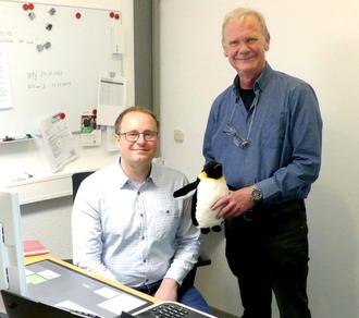 Heinz Schmitz (rechts) überreicht seinem Nachfolger Eduard Bayer (links) den Stoffpinguin „Piet“ als Inspiration für seine neue Aufgabe und erklärt: „Pinguine verfügen über einen optimalen Energiehaushalt, wodurch sie wenig Wärme verlieren und deshalb wenig Energie zur Aufrechterhaltung ihrer Körpertemperatur benötigen.“