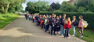 Am Dienstag, den 11. Juni, machten sich 102 Kinder unserer Schule mit ihren Lehrerinnen gut gelaunt und bestens vorbereitet auf den Weg zu unserem Wandertag. Noch bevor wir losgingen, stimmten wir uns gemeinsam auf den Tag ein – mit unserem Schullied, das alle lautstark mitsangen. Mit bester Laune ging es dann los. Ausgestattet mit Sonnencreme, Zeckenschutz und reichlich Verpflegung starteten wir bei bestem Wetter in Richtung Didderse – ein rund vier Kilometer langer Fußmarsch durch Wald und Wiesen an der Oker.