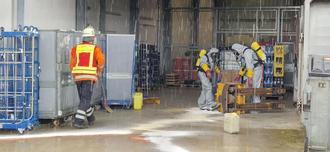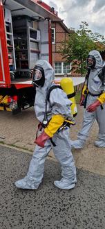 Müden. Auslaufende Batteriesäure löste am Dienstagvormittag (23. Juli) einen Großeinsatz der Feuerwehren in Müden aus. Über 40 Feuerwehrleute waren rund zweieinhalb Stunden im Einsatz. Um 11:20 Uhr alarmierte die Leitstelle die Freiwillige Feuerwehr Müden/Dieckhorst. Bei Entladearbeiten an einem Supermarkt an der Hauptstraße war der Elektrohubwagen von der Hebebühne des Fahrzeuges gefallen. Beim Aufprall auf dem Boden wurde die Batterie beschädigt, Batteriesäure lief aus. Die Müdener rückten mit ihrem Hilfeleistungslöschgruppenfahrzeug (HLF) unter der Leitung von Nicklas Meyer aus. „Bei unserem Eintreffen drohte die Säure in die Abflussrinne zu laufen“, so der Einsatzleiter. „Mit Ölbindemittel haben wir das eingedämmt.“ Außerdem wurde der Bereich abgesperrt und der Gefahrgutzug Nord alarmiert. Dieser rückte unter der Leitung des Zugführers Jens Goldenbogen mit sieben Fahrzeugen und knapp 40 Mitgliedern an. Geschützt mit leichten Chemikalienschutzanzügen und Atemschutz gingen zwei Mitglieder vor und banden die Säure mit speziellem Bindemittel und nahmen es anschließend auf. Nachdem die Gefahr gebannt war, verließen die Feuerwehren wieder die Einsatzstelle.
