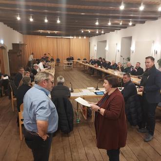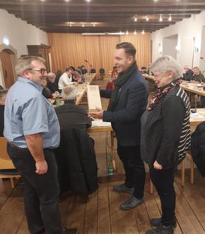 Hatten sich die Fraktionen SPD und WfO bereits in der November-Sitzung 2023 bei Hans-Werner Kraul für seine siebenjährige Arbeit als Bürgermeister bedankt, so holten die Fraktionen CDU, Bündnis90/Grüne und Die Linke ihre Würdigung in der Januar-Sitzung 2024 nach. Hans-Werner Kraul war am 23.01.2024 aus dem Amt geschieden. Eine Woche später folgte er der Einladung seines Nachfolgers und nahm in der Sitzung die Dankesworte und Präsente von Kerstin Dörfel und Marc Blanck (CDU), Jörg Lauenroth-Mago (Bündnis90/Grüne) und Silke Wolf (Die Linke) entgegen.