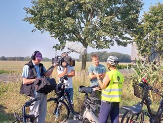 Nach der Begrüßung, diesmal durch Uta Bruns, setzte sich die Gruppe in Gang und wir konnten gleich ein Stückchen von unserem Ziel nutzen, den Radweg von Kathendorf bis Rätzlingen. Was für ein Glück, denn die Straße war überfüllt mit riesigen Traktoren, beladen mit Mais. Das Fernsehteam war begeistert von den massigen Unterschieden, die kleinen Fahrräder gegen diese Traktoren. Auf der Fahrt nach Bösdorf gab es so machen Stopp. Es wurde aus verschiedenen Perspektiven gedreht und so mussten wir immer mal wieder ein Stück zurück, um dann erneut an der gleichen Stelle vorbeizufahren. Dabei verging die Zeit recht schnell.