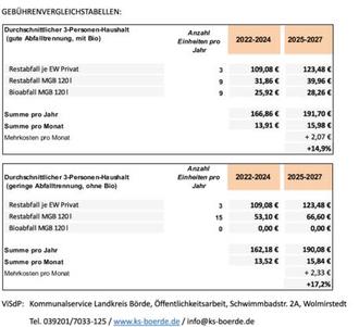 Wegen des aber insgesamt vergleichsweise günstigen Gebührenniveaus im Landkreis Börde bleiben die Zusatzbelastungen überschaubar. Für eine typische dreiköpfige Familie, die auf die Trennung ihrer Abfälle achtet und intensiv die Biotonne nutzt, steigen die Gebühren bei einer angenommenen durchschnittlichen Nutzung von 9 Leerungen der Biotonne und 9 Leerungen der Restabfalltonne von derzeit 166,86 EUR auf 191,70 EUR pro Jahr. Das sind 2,07 EUR mehr pro Monat als bisher. Für einen vergleichbaren Haushalt, der keine Biotonne nutzt und deshalb statistisch 15 Leerungen für Restabfall pro Jahr nutzt, entstehen Mehrkosten von 2,33 EUR pro Monat. Da die genaue Gebührenhöhe der