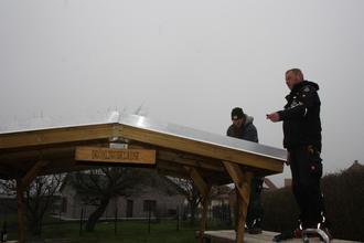 Am Samstagvormittag waren Enrico und Eddi Pagels gemeinsam mit Thomas Haushahn dabei, das Dach zu reparieren, welches dem letzten Sturm zum Opfer gefallen war. Da waren Blechplatten nun die beste Option.