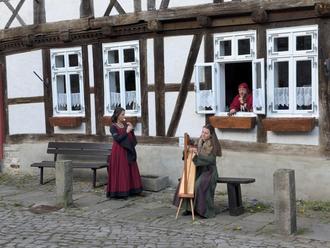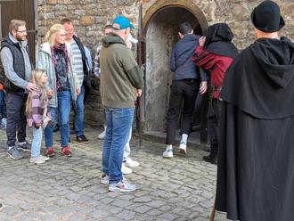 Dabei gab es für die Gäste viel zu sehen und erleben. Nach der musikalischen Begrüßung des Minnesängers, seiner Geliebten und der Tochter wurden die Anwesenden durch den Nachtwächter begrüßt. Nachdem der Pestdoktor zunächst die an Pest und anderen ansteckenden Kranken aus der Gruppe herausholte und diese außerhalb der Stadttore trieb, konnte der Nachtwächter die vom Magistrat angemeldeten neuen Bewohner erst durch die Burg und dann durch die Altstadt führen. Dabei gab es für die Gäste viel zu erleben. So wurde ihnen das Leben im Mittelalter erklärt. So, weshalb der Burgherr bei Gefahr „türmen“ konnte, die Reisenden zu abendlicher Stunde „torschlusspanik“ hatten, als sie noch den Schutz der Stadt suchten, wann jemand etwas auf dem „Kerbholz“ hatte oder weshalb jemand schon mal die „Kurve kratzte“. Alles alte Begriffe aus dem Mittelalter, die ihre eigene Bedeutung haben.