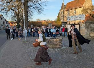 Erstaunlich für die Akteure ist immer wieder, wie sich die begleitenden Besucher bei der Szene mit dem armen Bettler mit seinem Holzbein und Sackkostüm manipulieren lassen und zum Teil beängstigt sind.