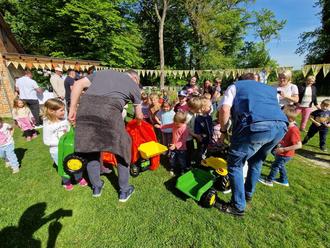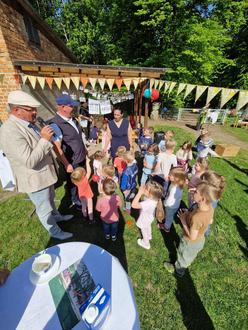 Ihr Hagenwichtellied sangen die Jungen und Mädchen am 30.04.2025 – Genau 75 Jahre nach der Gründung des Kindergartens auf dem Hagen in Walbeck. Zur Jubiläumsfeier präsentierten die Kinder dieses Lied in abgewandelter Form. Sie besangen ihren Gast Marc Blanck. Der Bürgermeister kam am Nachmittag zur großen Überraschung, einem Programm mit dem Zauberer. Diese hatten die Erzieher in einem großen Paket verpackt, das die Waldfee Marita Schöndube gemeinsam mit Kita-Leiterin Nancy Osinsky öffnete. Unter den Gästen befand sich Ortsbürgermeister Thomas Wetteborn, der sich noch gut an seine Kindergartenzeit erinnern konnte und berichtete, dass auch sein Vater schon als kleiner Junge auf dem Hagen gut aufgehoben war. Wie es in der Anfangszeit auf dem Hagen zuging, davon berichtete die Waldfee. Den Gästen pustete sie glitzernden Feenstaub entgegen, von dem auch Martin Herrmann etwas abbekam. Der ehemalige Bürgermeister und Ortsbürgermeister von Walbeck ist immer wieder ein gern gesehener Gast auf dem Hagen. Und schließlich gesellte sich Landrat Martin Stichnoth dazu, der gerne den Einladungen von Kitas folgt und noch einmal nach Walbeck kommen möchte, um dann als Kleintierzüchter ein paar Stunden gemeinsam mit den Kindern zu verbringen.